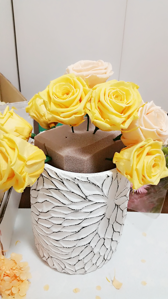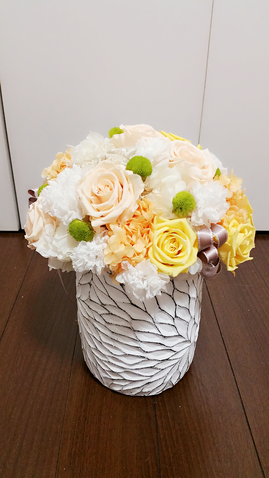 結婚式の内祝いとして、プリザーブドフラワーのオーダーいただきました。 美容室様への納品で、「淡い色のアレンジ」希望との事で、 黄色メインのやわらかいグラデーションにしました。 黄色って、心が明るくなりますよね~。 そして金運の色♡ 一目ぼれしたこの素敵な器に、全てが丸くいくまるアレンジ☆ 360°アレンジは、どこから見ても丸くするととっても可愛い♡ くるくる回しながら、綺麗な丸を作っていく~。 とっても楽しく作らさせていただきました。 毎日がミラクル☆(完) ブログ見ていただきありがとうございます。 Posted on 2016年10月23日2016年10月23日 by flower999 Categories: プリザーブドフラワー