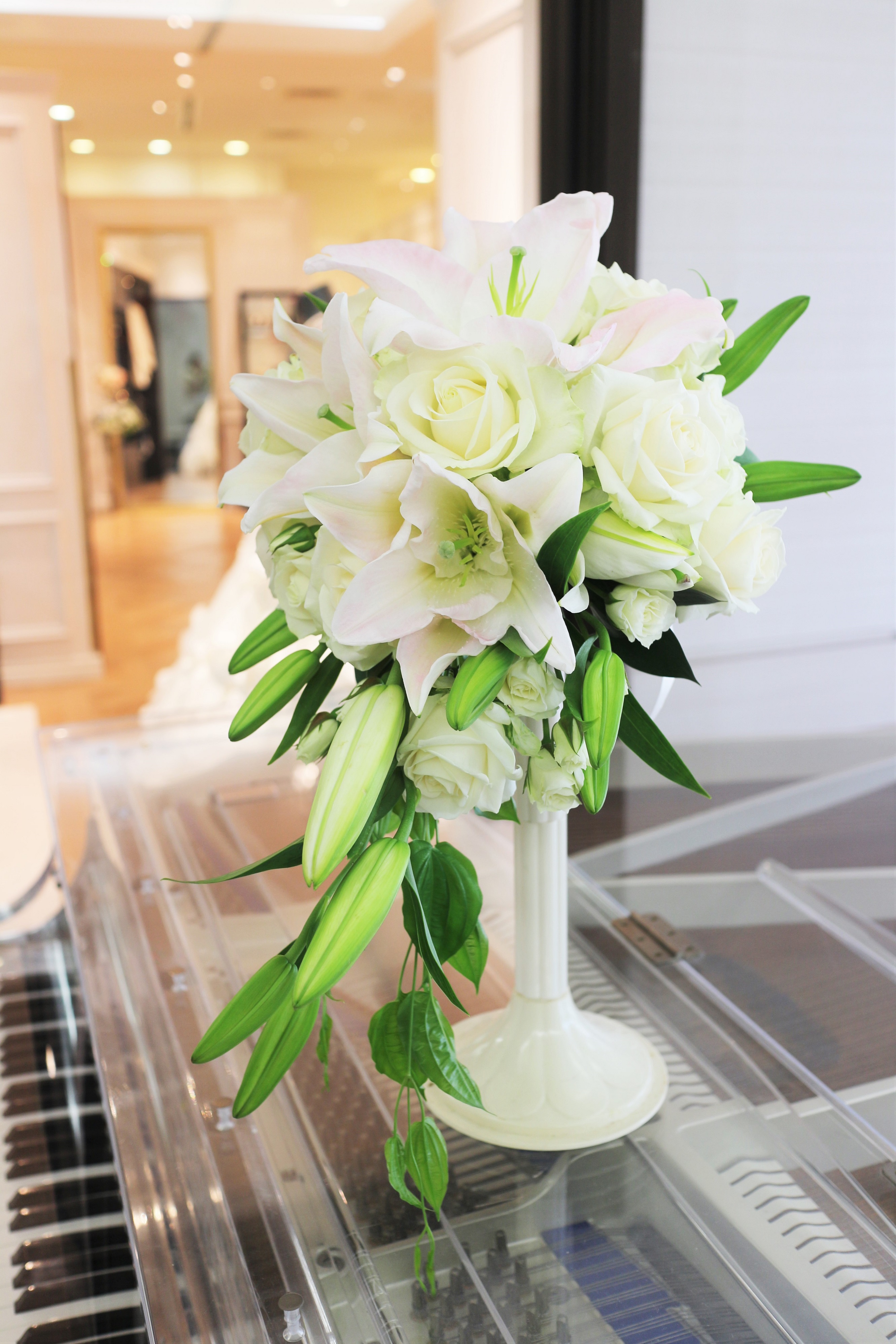 淡いピンクが入ったユリを真ん中へ~ 新婦さんのイメージで キャスケード ユリは神の花と言われています 神秘的な香りが式を一層素晴らしいものにしてくれるでしょう 愛を込めて 心から最高のウエディングを祈りました (完) Posted on 2016年11月22日2016年11月22日 by flower999 Categories: 未分類, 生花